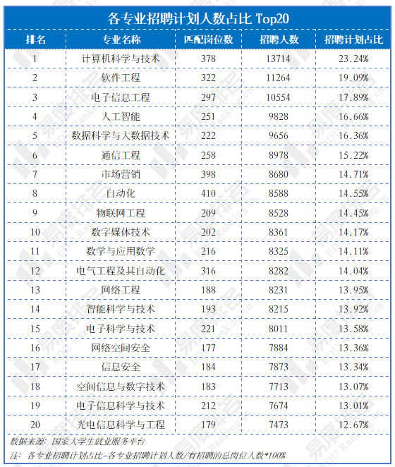 仅看岗亭笼盖率,能领会一个专业的适配面有多宽。而打算招录人数及其占比能进一步展示市场对某一专业人才的吸纳容量有多大。正在聘请打算占比Top20中,消息手艺大类专业(包罗计较机、软件、电子消息、人工智能、大数据、通信、物联网等)占领了绝对从导地位,包办了前6名以及榜单中的绝大大都席位。排名第一的计较机科学取手艺,其打算招录人数占到了统计总盘子的23。24%。消息传输、软件和消息手艺办事业做为薪酬和预算的“双冠王”,其增加间接为对相关专业结业生集群式、规模化的聘请需求;从动化正在笼盖率排名第一(最广)的根本上,其打算聘请人数仍然高居前列,占比超14%。